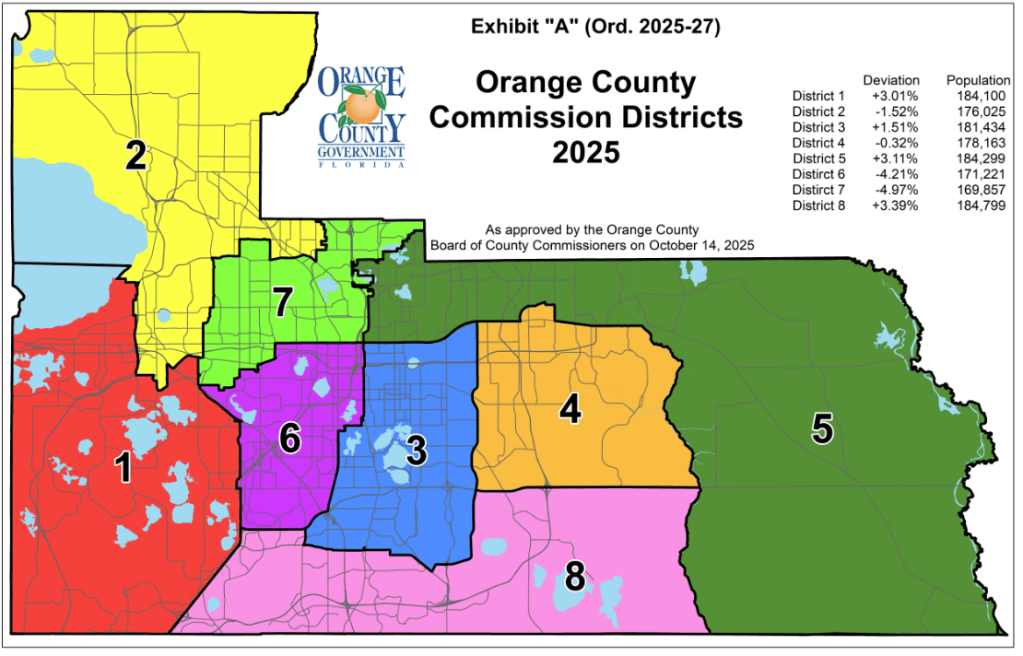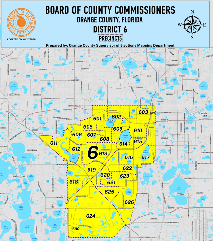 Following voter approval in November 2024 to expand the Orange County Commission from six to eight districts, the Board of County Commissioners launched a mid-decennial redistricting process to implement the change. In January 2025, the BCC established the 2025 Mid-Decennial Redistricting Advisory Committee, which spent seven months gathering community input and evaluating proposed district maps. The committee presented two recommended maps to the BCC on September 16, 2025, followed by a public hearing on October 14, 2025, where the Board adopted Map 7B by a 5–2 vote. Effective for the 2026 election cycle, the new map reshapes District 6 into a markedly different structure than before—realigning communities and geographic boundaries to reflect population growth and the expanded commission. Incumbent commissioners are not affected and will complete their terms as usual, while the Supervisor of Elections will begin assigning precincts to the newly drawn districts.